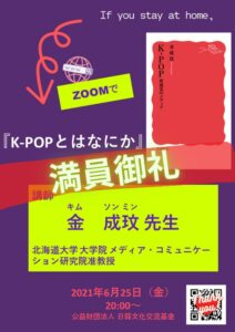 6月25日 オンライン講演会 『K-POPとはなにか』 ご視聴 ありがとうございました 2021.06.28 ニュース さる6月25日(金)に開催しました、当基金の2021年度オンライン講演会はたくさんの方がご視聴くださいました。誠にありがとうございました。 今後とも、当基金の活動にご関心をお寄せくださいますよう、お願い申し上げます。