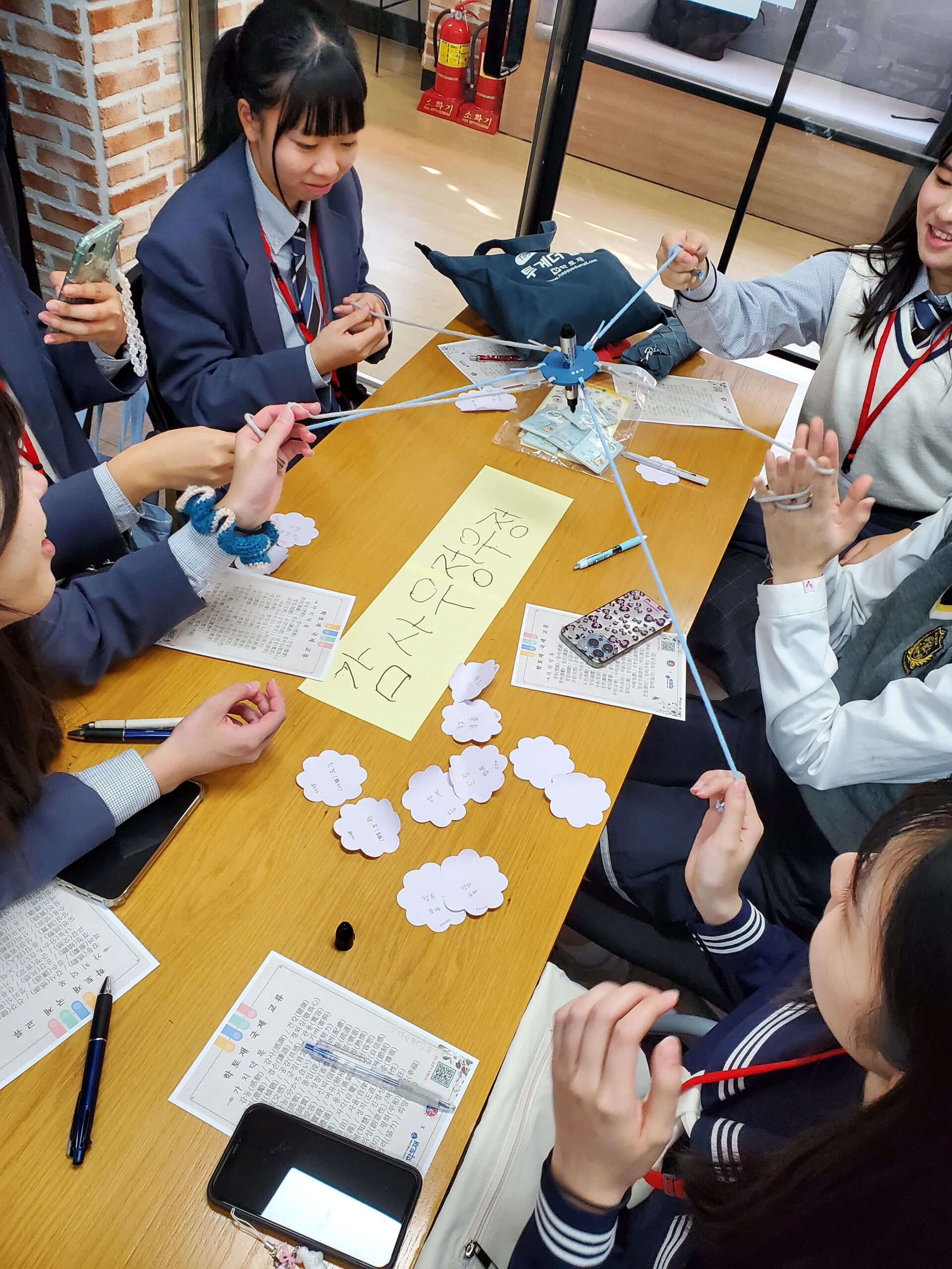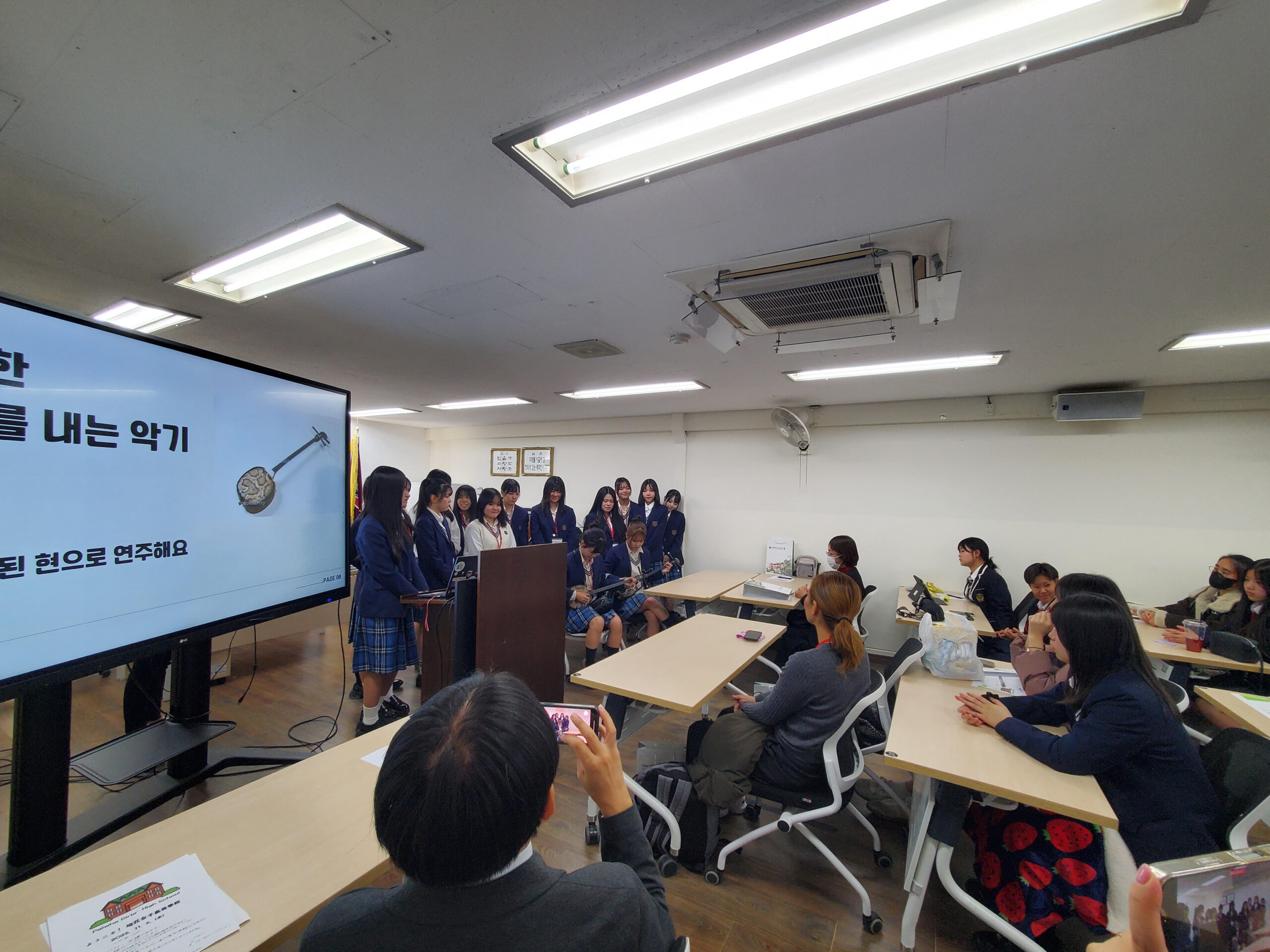 沖縄県の高校生の皆さんは培花女子高等学校を訪問しましたが、地域の魅力を紹介する時間には三線の演奏やカチャーシーを披露し、チームワークを学ぶ授業ではグループごとに共同作業に取り組むなど、さまざまな体験を通して交流を深めました。また、2019年度の高校生訪韓団で同校を訪問し、現在韓国の大学に通う訪韓団出身の先輩も駆け付け、交流を盛り上げてくれました。