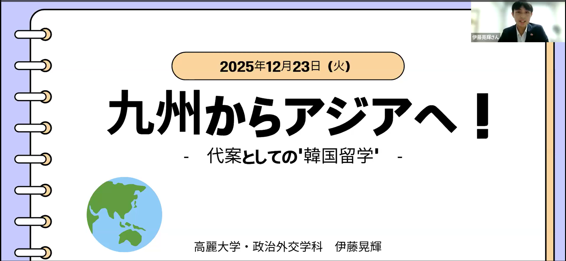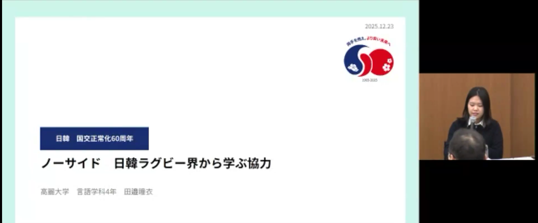 また、共に韓国・高麗大学に在学中の田邉瞳衣さんと伊藤晃輝さんは、日韓関係にまつわる自身の留学生としての体験や思いを、関連するエピソードを交えて発表してくださいました。