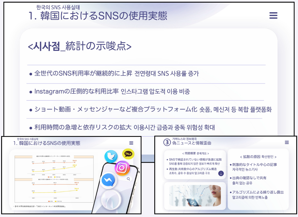 韓国側参加者が自主的に渡航経費を工面して来日し、日本と韓国の共通の課題である「SNSによる社会問題」および「日韓の若者のこれから」をテーマに、参加者それぞれが自身の考えを示し、解決策や今後の発展方策について発表しました。