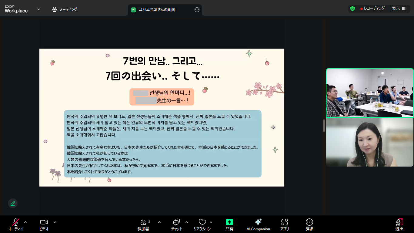 (七尾めぐみ先生、小学校教員)今回韓国の先⽣⽅と直接交流することで、私⾃⾝の教育者としての資質を⾼め、それを⼦どもたちに継続的に還元できる関係を築き上げることができたと思います。参加してくださった先⽣⽅、本当にありがとうございました。このような貴重な経験を今後多くの先⽣に広めていきたいです。